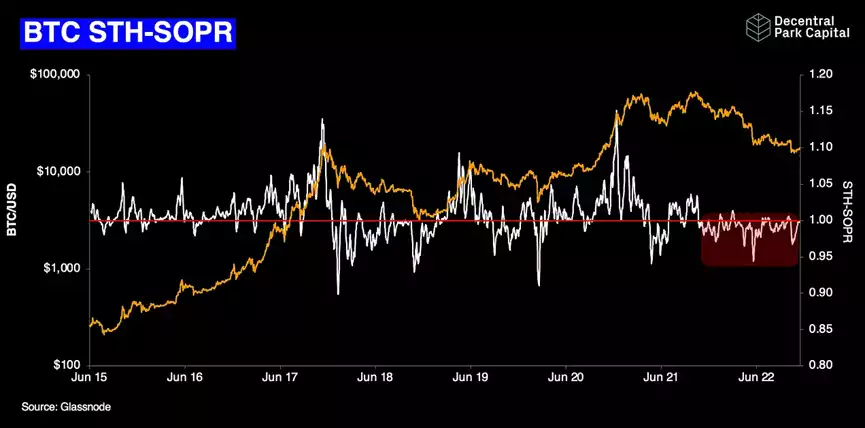 内容:到 2022 年,比特币的短期持有者支出产出利润率 (SOPR) 将被抑制在 1 以下。该指标反映了链上所有 Token 的实现利润程度。