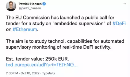 MiCA 不适用于 DeFi,只要 DeFi 的服务是完全去中心化(a fully decentralised manner),并且没有任何第三方的参与。MiCA 没有进一步阐述「完全去中心化」的定义,这对于 DeFi 项目来说还是有点模糊。此外,据 Circle 欧盟战略与政策总监 Patrick Hansen 表示,欧盟委员会已经公开招标「DeFi 在以太坊的嵌入式监管(Embedded Supervision of DeFi on Ethereum)」研究,旨在研究通过自动读取公链数据配合监管控制 DeFi 的能力。