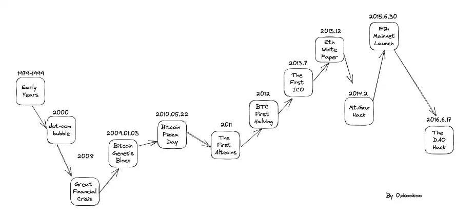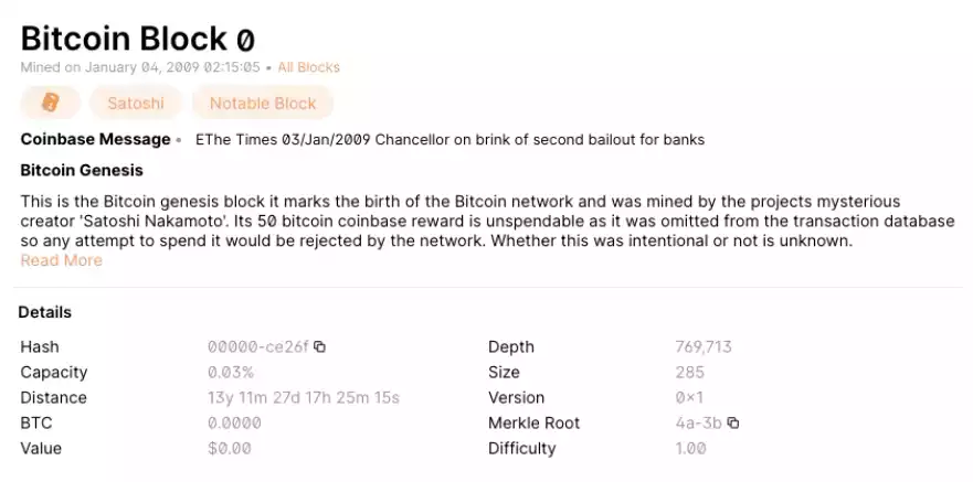 20092009 年 1 月 3 日,中本聪创造了比特币的第一个区块,即「创世区块」,并附有一句「The Times 03/Jan/2009 Chancellor on brink of second bailout for banks」,而这句话是当天泰晤士报的头版文章标题。