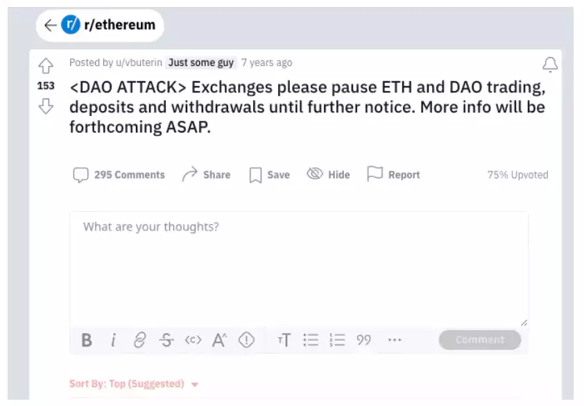 2016 年 6 月 17 日,Vitalik Beterin 在 Reddit 上发布紧急通知,「DAO 遭到攻击,请交易平台暂停 ETH/DAO 的交易,充值和体现,等待进一步的通知,新消息会尽快更新」。这里的 DAO 指的是 The DAO,是区块链公司 Slock.it 发起的一个众筹项目,他们想创建一个真正的去中心化自治组织(Decentralized Autonomous Organization)