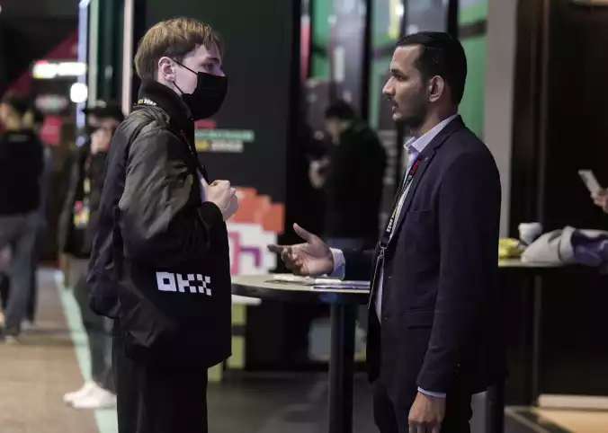 「我周围抄币的人都知道欧易 OKX,如今大家挺火。」中国台湾客户在欧易 OKX 展台与管理人员沟通。