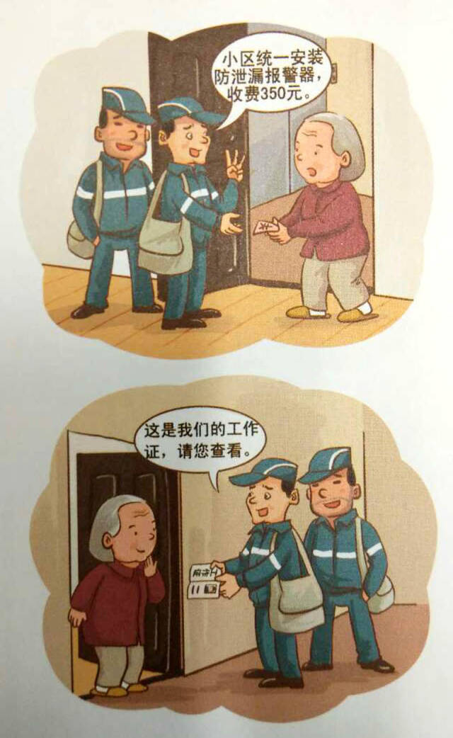于大妈家里突然来了两位自称是燃气公司的工作人员,为用户统一安装“防煤气泄漏报警器”。于大妈热情地将两人请进门。