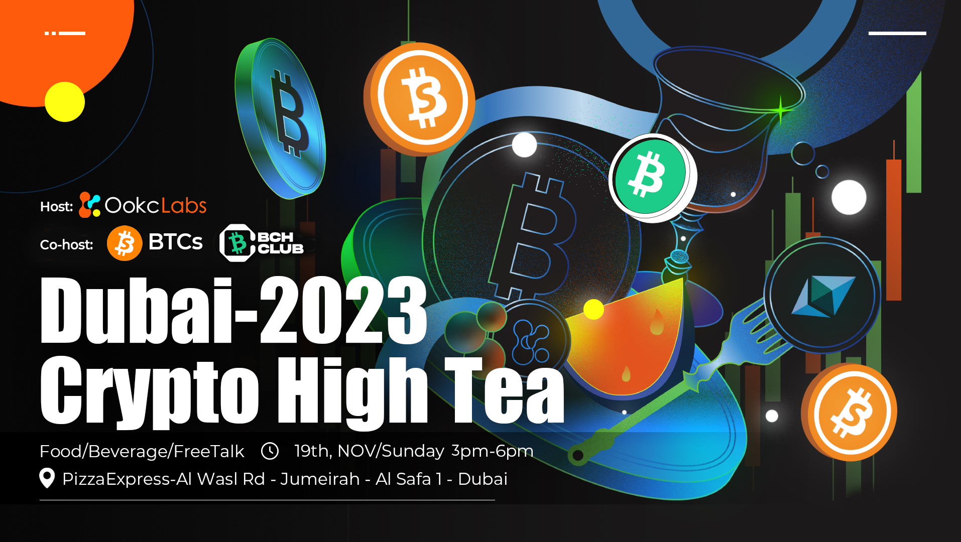 总部位于迪拜的多策略加密技术金融公司 OokcLabs 将于北京时间 11 月 19 日 20:00 至 22:00,在迪拜 PizzaExpress-Al WasI Rd -Jumeirah - Al Safa 1- Dubai 举办「2023 年加密下午茶」。邀请与比特币生态感兴趣用户一同线下交流,探索加密货币范式。