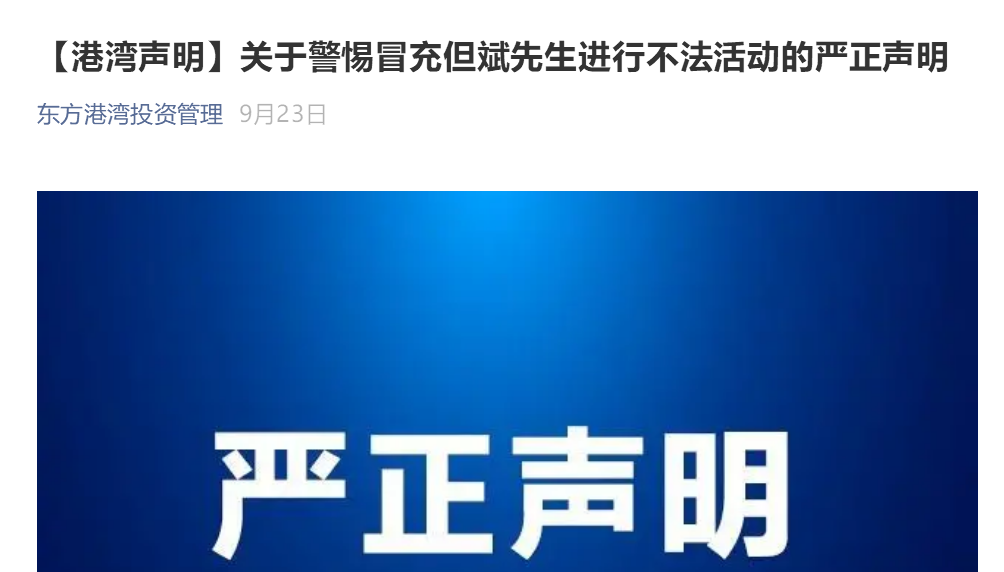 此前,东方港湾相关人士也告诉中证君,有不法分子冒充董事长但斌,通过网络公开信息盗用但斌个人微信图片并以但斌名义注册微信公众号,发布最新股市观点、但斌或东方港湾的获奖信息,或创建微信号(群)以推荐股票、指导操作等方式诱骗广大投资者以谋取非法利益。