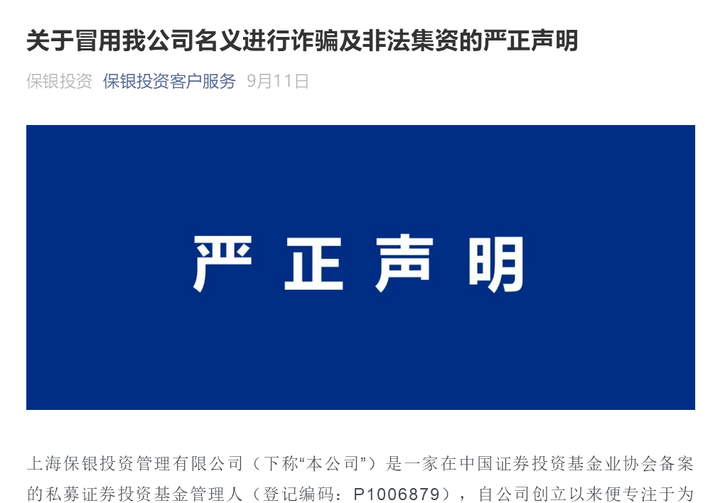 实际上,此前有多位私募大佬被“假冒”,多家私募也有被李鬼缠身的经历。9月份,保银、东方港湾、东方马拉松等也遭遇过类似情况,并发布了警惕诈骗的声明。