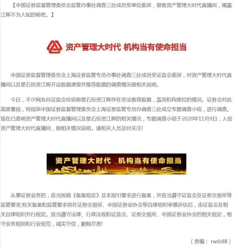 骗子冒充监管称不少网友向证监会投诉江晖存在非法荐股、滥用机构席位的情况,对此证监会高度重视,指派中国证券监督管理委员会监管办事处调查三处成员成立专题调查小组,并做客资产管理大时代直播间,揭露江晖不为人知的秘密,并对相关情况进行说明。简直太嚣张。