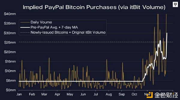 10月底,PayPal上线比特币服务后,其购买的比特币已经超过了新供应的100%。