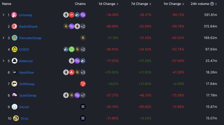 不容置疑,Uniswap 是 DeFi 行业最大的一个去中心化交易运用。依据 DeFiLlama 的信息,9 月 26 日,Uniswap 24 钟头交易量为 5.91 亿美金,位居全部 DEX 第一,比排到第二位的 RadioShack 空出近 2.8 亿美金。