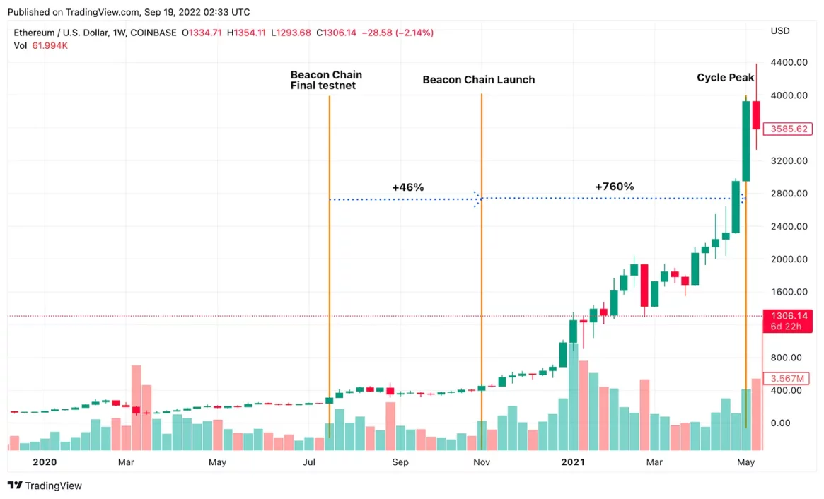 合并今年在六月初正式进入测网,在 Sepolia 开展第二次规模性检测后,ETH 从 6 月初期的 800 美金底端大幅度反跳,伴随着主网上线合并日期在 8 月明确,ETH 价钱基本上到达 2000 美金。这一过程实际上是预估蹭热点环节。