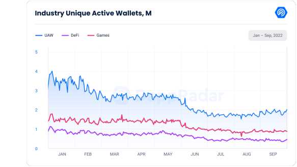 尽管该行业呈看跌趋势,但仍有一些一线希望对Dapp行业的未来方向保持乐观。 与上一季度相比,UAW Flow增长了79%,在9月份达到了近50,000个独立活跃钱包。 此外,ImmutableX在第三季度增加了其独特的活跃钱包,从8月到9月增长了30%。