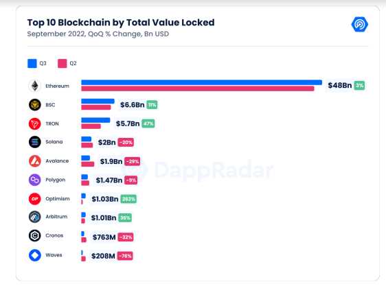 从好的方面来说,见证Layer2的增长令人兴奋,Optimism和Arbitrum的TVL都达到了10亿美元,比上一季度有了显着增长。 乐观情绪上升了263%,而Arbitrum上升了35.555%。 这一增长是由以太坊合并推动的。