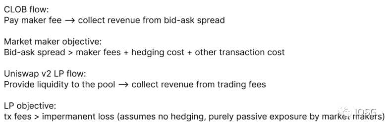 要是直接套入传统式金融行业会计的国际惯例,就会得到这种论点论据:总费用应当相当于总收入。可是却常情而言这有失公正,由于该笔收入里的很大一部分实际上不属于协议,反而是归属于流动性提供者。比如,运用演绎推理,假如银行可存款人利息收入做为最大收入线,那样借款协议能将 LP 利息收入做为最大收入线,因而 AMM 能够对协议支付的总费用做相同的对比。另一方面,对其 AMM 交易中心与 CLOB 交易中心开展对标时,这类计算会导致一些不一致的状况。
