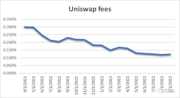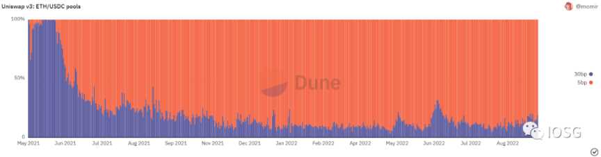 2021 年,Unigwap 上线了 v3,大大的影响了 LP 和平台的互动形式。换句话说,在 v3 中,流动性提供者无须遵循统一分配,并还有机会更为积极主动开展开放式管理方法。这造成了越来越多 5bps 和 1bp 水池,流动性提供者 / 做市还可以在相对较低的交易手续费和更有效率的监管中间获得均衡,且有可能从买卖价差中获得盈利。