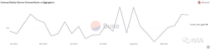 掌握和用户之间的关系:唯有通过和用户立即取得联系,Uniswap 才可以减少学生的价格敏感性。换句话说,Uniswap 大量的成交量来源于 DEX 聚合器,这种聚合器为流动性很强的消费群体给予订单信息,这种客户只注重取得最好价钱,对于任何特定交易中心也没有满意度。伴随着 DEX 聚合器增长,Uniswap 有可能会与其它关键流动性来源市场竞争,与此同时让聚合器和用户之间的关系货币化安置。