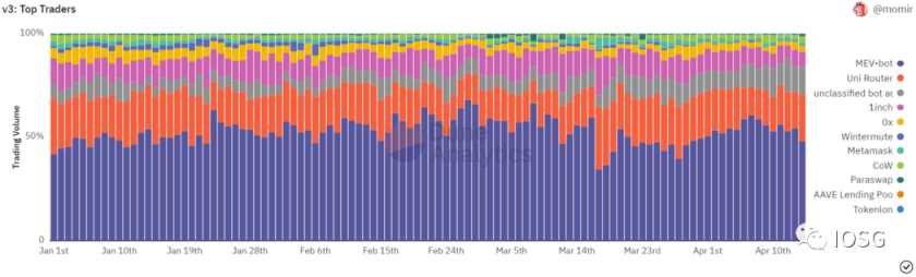成交量的品质:a)假如 Uniswap v3 中的大多数成交量是通过 MEV 智能机器人完成,怎么会这样?一部分主要原因是对于散户的三明治进攻,但也是因为低效能的流动性提供者逐渐被对冲套利。假如 Uniswap 的成交量有很大一部分是通过不成熟的流动性经销商所造成的,那么这样的动态变化可持续怎样?b)成交量是不是遭受鼓励?