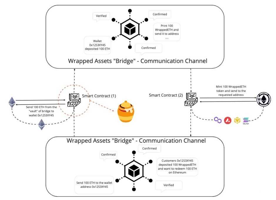 包囊式资产跨链体制的操作流程与以上金本位中的货币体制同样,假如你需要把 100 个原生态 ETH 传送到其他网络,那样外包装资产的项目团队既需要在数字货币上建立智能合约 (1),则在总体目标链 ( 如 Polygon、Solana 或 Avalanche) 上也需要创建一个智能合约 (2)。