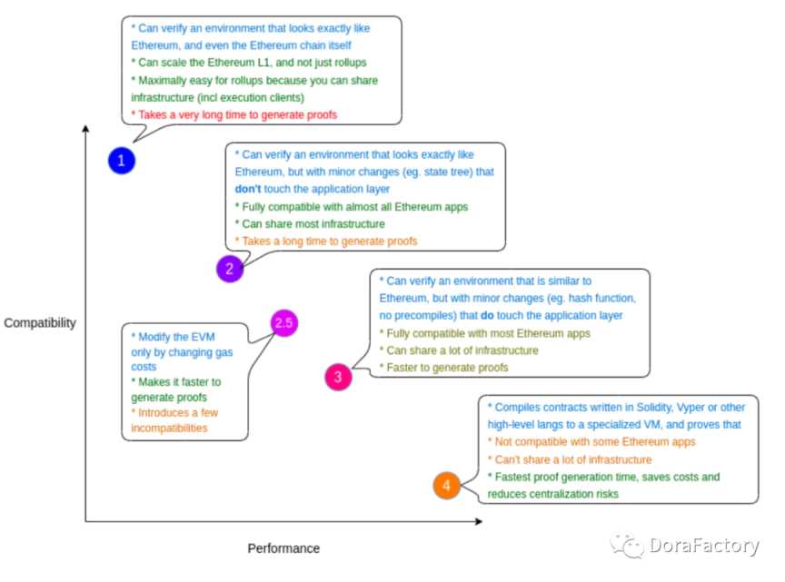 EVM 兼容模式很有可能代表着不同类型的事儿。Vitalik 近期发布了一篇按类型 (1-4) 对解决方法进行筛选的帖子,在其中种类 1 是很适配 EVM 的。Polygon zkEVM 被称作第 3 类,向第 2 类发展趋势,大家对于此事表示同意。