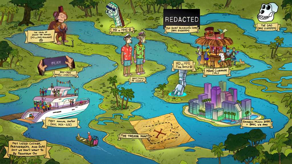 2021.09.13 | 推出互动寻宝活动,社区成员探索俱乐部内外,解决了一只名为 Jimmy 的猴子留下的谜题。奖品包括 10 ETH,一个 BAYC, 一个 BAKC, 一个合成 MAYC 的毒液和一对由 RTFKT 制作的特别礼物。 |