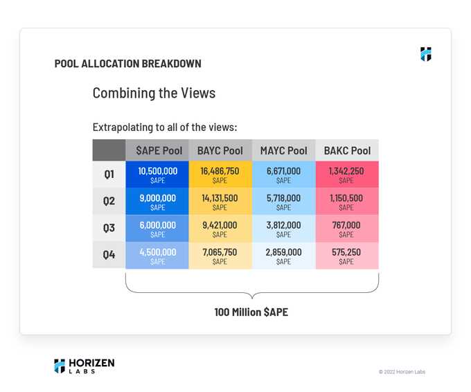 Horizon Labs 预计 10.31 日上线的质押系统,将为期三年分别释放 100M, 50M, 25M $APE,收益率相对不错。(详见项目历史和路线图-质押系统)