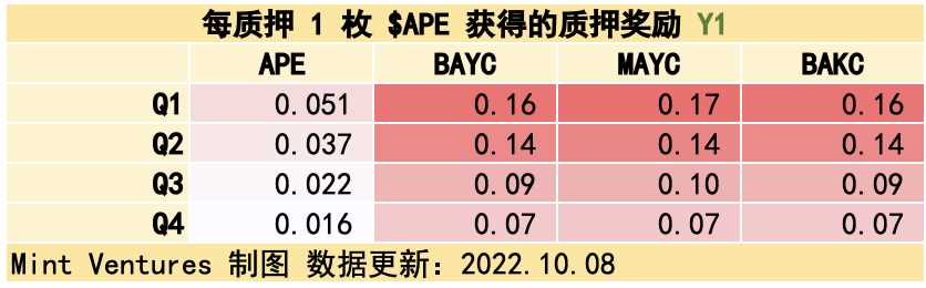 总计 175M 枚 $APE(代币总额的 17.5%)将在三年释放完毕。按年度/季度看,质押奖励的代币释放速度递减,第一年释放 100M $APE,占总流通量的 10%;第二年释放 50M $APE,占总流通量的 5%;第三年释放 25M $APE,占总流通量的 2.5%. 在季度分配上,也基本遵循线性递减的设定。