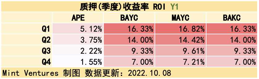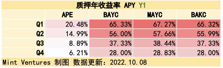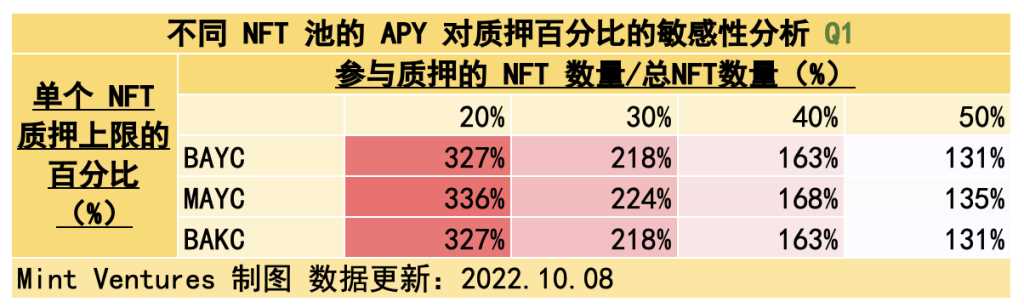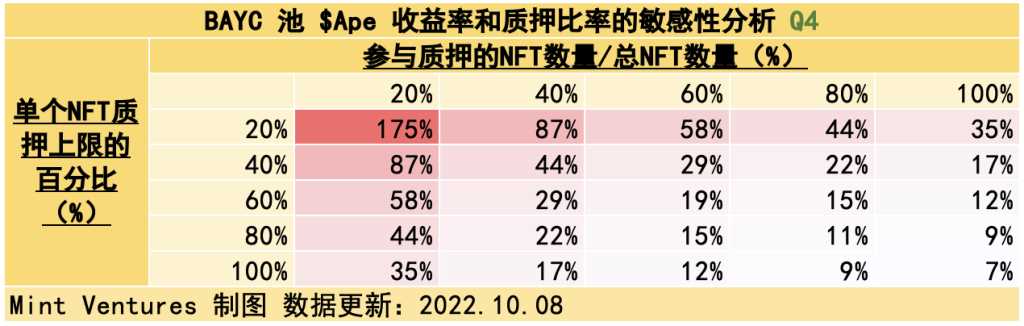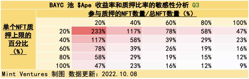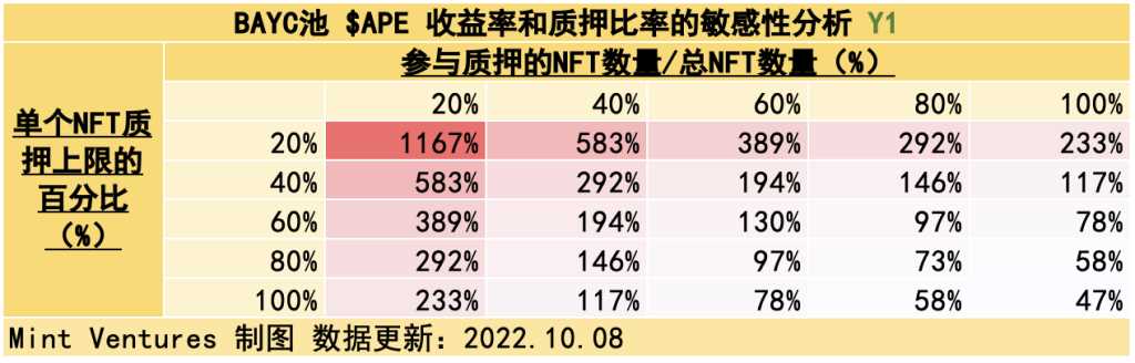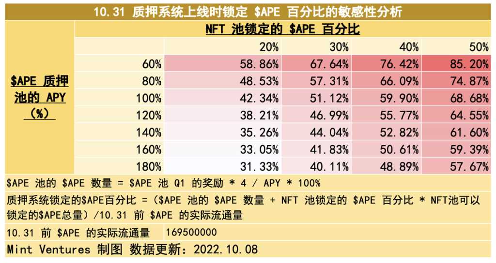 可见,10.31 质押系统上线时,大致的吸纳流通量区间可能在 31.33% – 85.20%。如果 $APE 质押池以 $APE 计价的 APY 为 180% 且 NFT 池的锁仓量达到上限的 20%,会吸纳 31.33% 的实际流通量,此时 NFT 池的 APY 将高达 327 – 336%,在熊市是相当可观的 APY。如果 $APE 质押池以 $APE 计价的 APY 为 60% 且 NFT 池的锁仓量达到 50%,会吸纳 85.20% 的实际流通量,此时 NFT 池的 APY 为 131% – 135 %。
