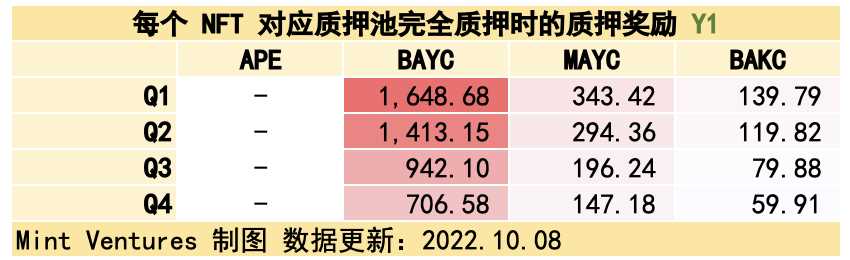 质押系统有 4 个代币池,纯 $APE 代币池、持有 BAYC 的代币池、持有 MAYC 的代币池,和持有 BAKC 的代币池(此代币池需同时持有 BAYC 或 MAYC 才能解锁)。NFT 在这里更像一把功能性钥匙,本身无法质押产生收益,但可以解锁潜在收益率更高的质押池。