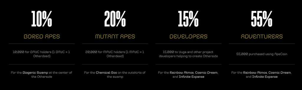 2022.03.24 | 宣布推出的元宇宙项目 Otherside 将采用 $APE 购买土地,并在后续确定一口价 305 $APE。收到的 16,775,000 枚 $APE 将锁仓 1 年,在这一年内也不会 ApeCoin DAO 的投票。 总共 55,000 $APE 供 KYC 钱包购买,BAYC(10,000) 和 MAYC(19,425) 的持有者将可以在后续 21 天自主申领自己的 Otherside NFT。 |