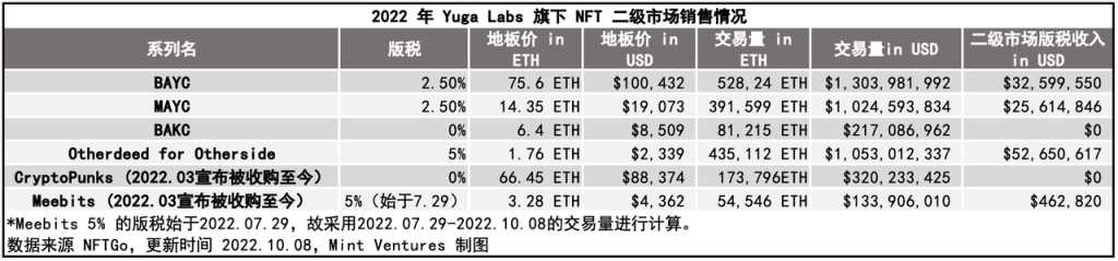 Yuga Labs 旗下的业务包括 4 个原创 NFT 系列(BAYC、MAYC、BAKC、Otherdeed for Otherside)和 2 个收购的 NFT 系列(CryptoPunks, Meebits)。