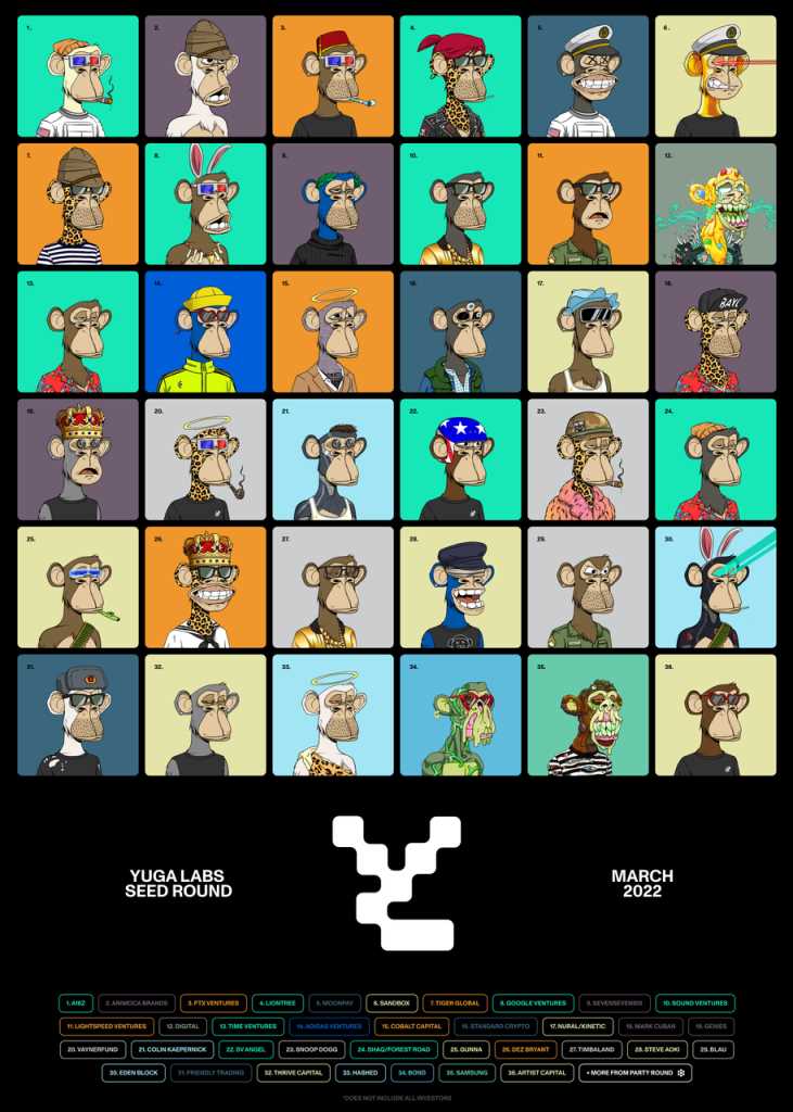 2022.03.22 | Yuga Labs 宣布完成 4.5 亿美元的种子轮融资,估值 40 亿美元。a16z 领投,Animoca, FTX, Moonpay, Sandbox, Tiger Global, Google Ventures等跟投。 |