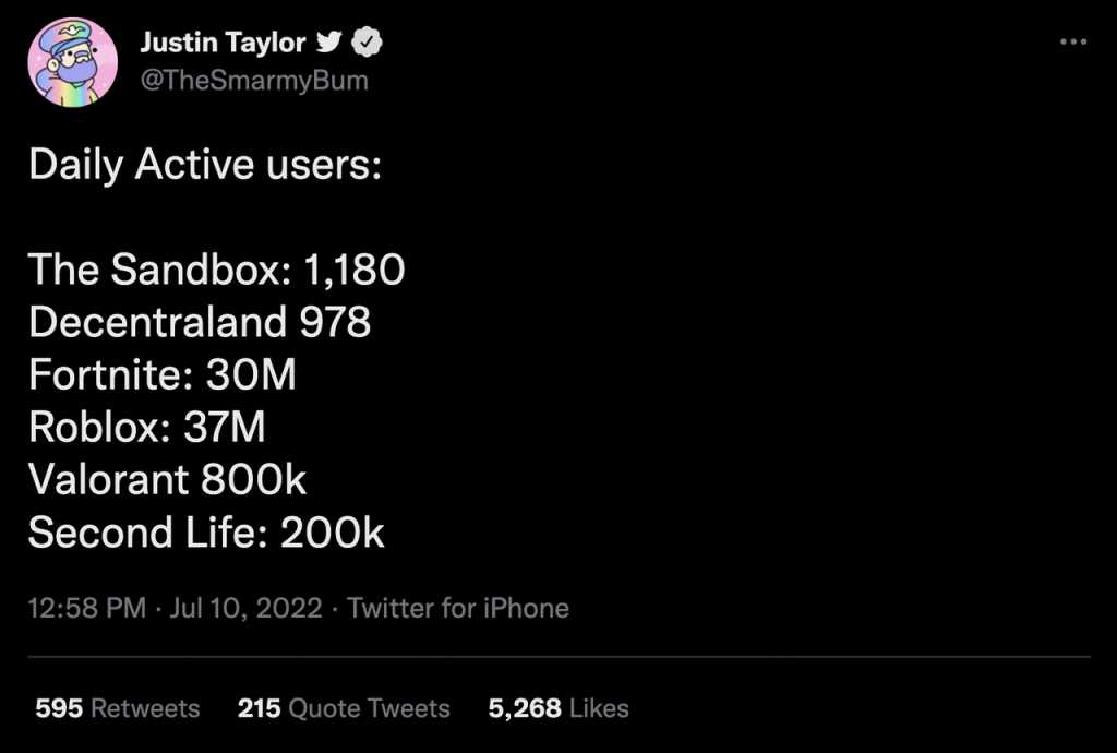 目前,尽管 Web3 元宇宙概念仍然火热,头部项目维持数十亿美元的市值,Web3 沙盒游戏的日活跃用户数却相当惨淡,2022 年 7 月 10 日,Twitter 市场总监 Justin Taylor 的一条推文里做了这样一个数据对比: