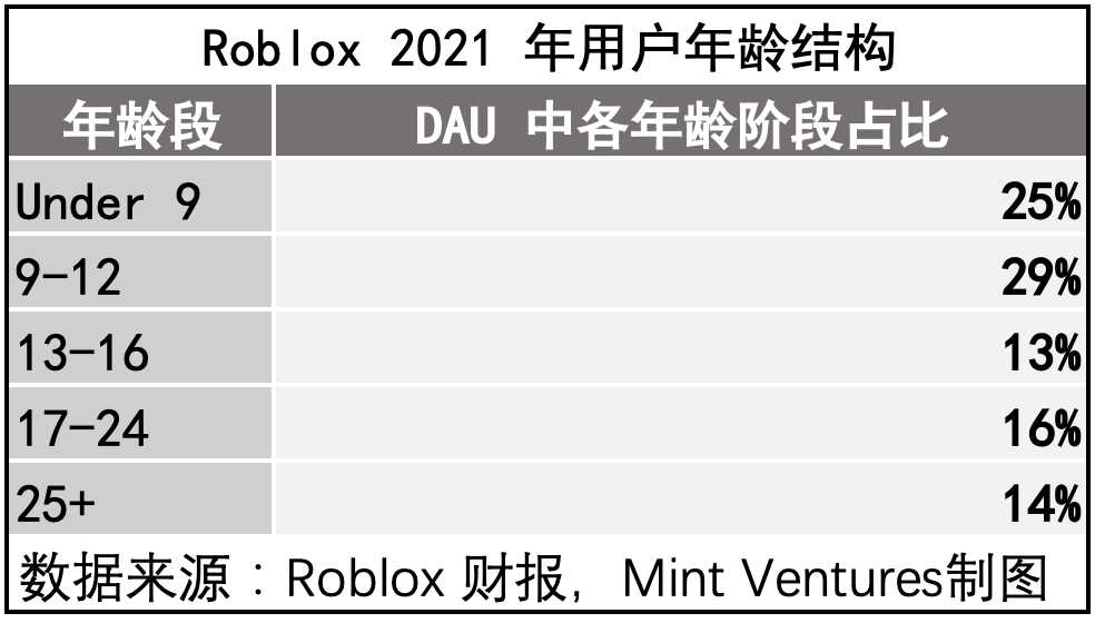 根据 Roblox 公布的 2021 年用户年龄结构数据,用户的年龄分布如下: