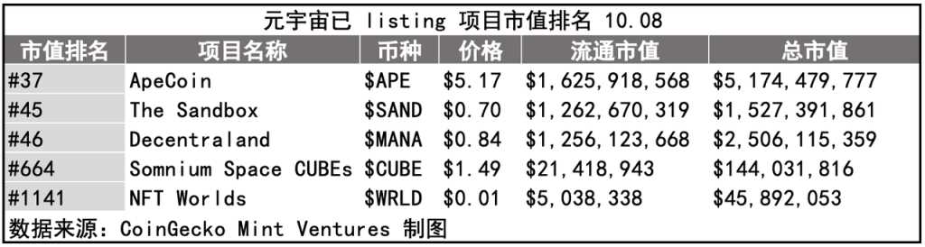 不同元宇宙项目的横向对比: