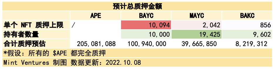 对于 4 种代币池的奖励分配,将依据上一年 Q4 的 NFT 价格决定。其中,$APE 的奖励池将固定分配当年总奖励池的 30%,其余 3 个需要 NFT 解锁的奖励池则随后续价格浮动,NFT 价格越高,质押池对应的 $APE 分配比率越高。另外,需 NFT 解锁的奖励池有单用户质押存入上限的限制,而仅需 $APE 的奖励池则没有上限。单个 BAYC 的质押存入上限为 10094 枚 $APE,单个 MAYC 的质押存入上限为 2042 枚 $APE,BAKC 如果与 BAYC/MAYC 相匹配,能够存入的 $APE 上限为 856 枚 $APE。NFT 池质押上限的设立,是为了保证 NFT 持有者在质押奖励上获得比普通 $APE 持有者更高的潜在回报。