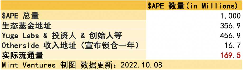 虽然 $APE 名义上的流通比率已经到了 34.6%,实际上,由于投资人和 DAO 国库的暂时资金没有真正在市面上流通,$APE 的实际流通量会更小。