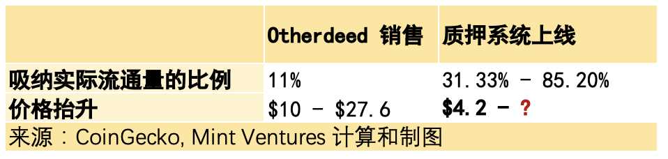 由此可得,质押系统上线时对实际流通量会有很大影响,结合上一次 Otherdeed 土地销售时的情况,可以做一个较为简单粗暴的情况对比: