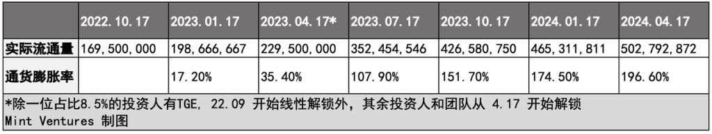在投资人和团队大量解锁时(2023.04.17),实际流通量将相比 2022.10 提升 35.4%。而如果投资人和团队大量解锁后也立即抛售手上的 $APE,同时 Otherdeed 的 $APE 收入锁仓到期后也直接抛售,即使不考虑生态基金的 $APE 抛售,一年后实际流通量增加 151.7%,一年半后实际流通量增加 196.6%。