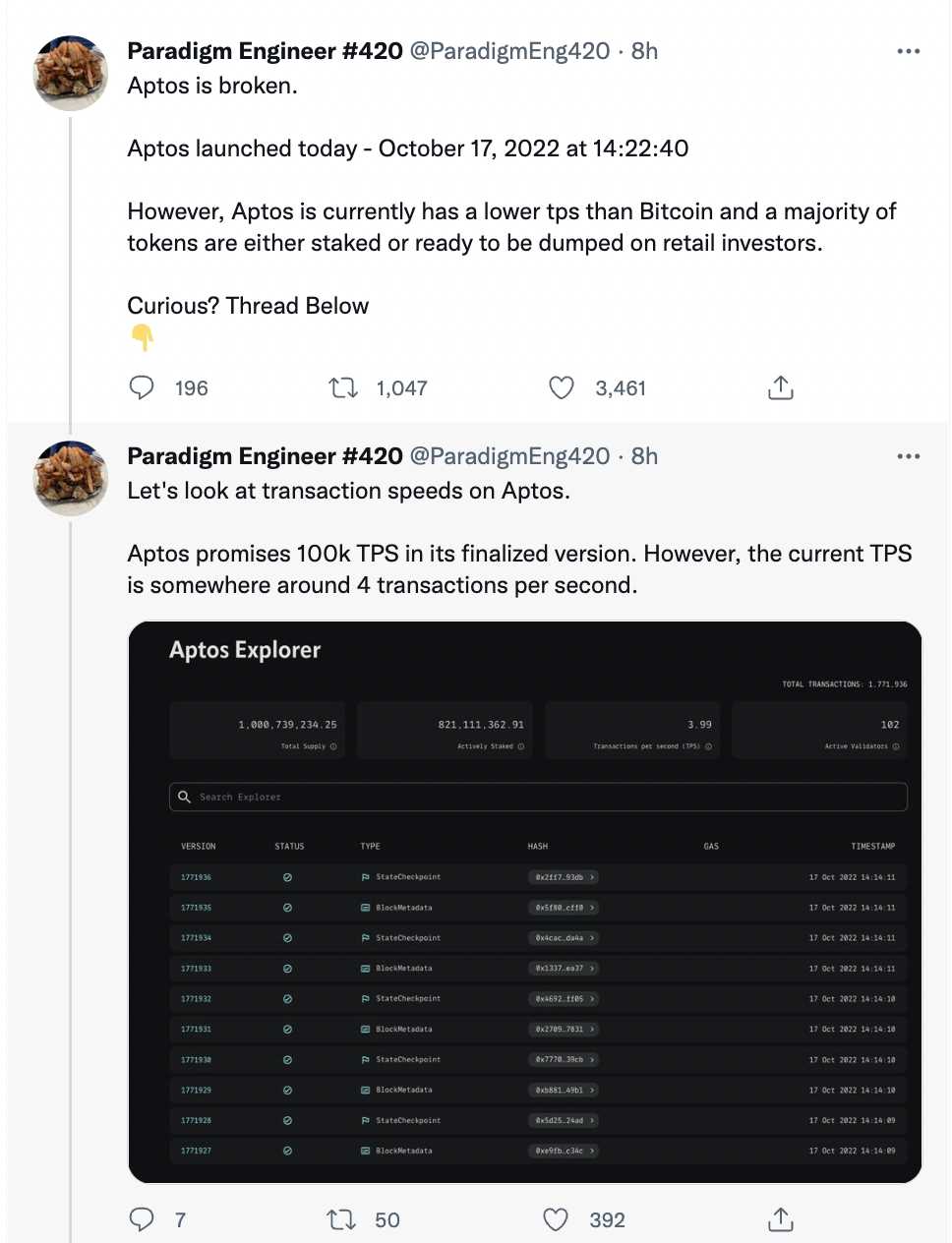 推特网用户1——现阶段Aptos TPS小于BTC,超80%APT供货由工作团队投资人操纵