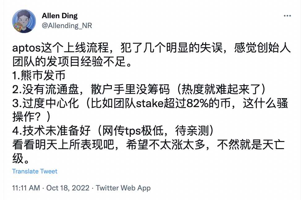 推特网用户2——Aptos上线步骤犯好多个显著出错,觉得创始人团队的一个项目缺乏经验