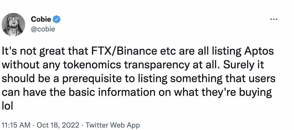 不过有一点很值得注意一下,那便是FTX和币安网等交易中心不该在没有任何区块链学清晰度的情况下发售Aptos,如同推特网用户Cobie上述,交易中心需要列举一些东西的前提条件,用户应当有他所购买商品的相关信息。