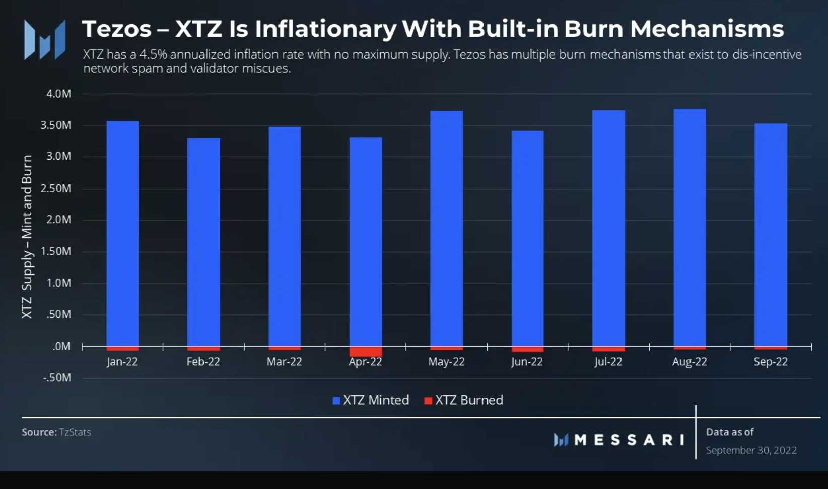 XTZ是Tezos生态系统的原生代币,其平均年化通胀率为4.5%,没有最大供应量。XTZ还具有多种销毁机制,包括:在创建新的Tezos帐户时、在创建新的智能合约时、在分配额外的智能合约存储时以及在验证器错误时进行惩罚。代币是故意的,并不重要,相反,它们的存在是为了减少网络垃圾邮件和验证器错误。截至2022年,Tezos每月平均燃烧73,000 XTZ(相当于每月新铸造供应的2%和总供应的0.01%)。