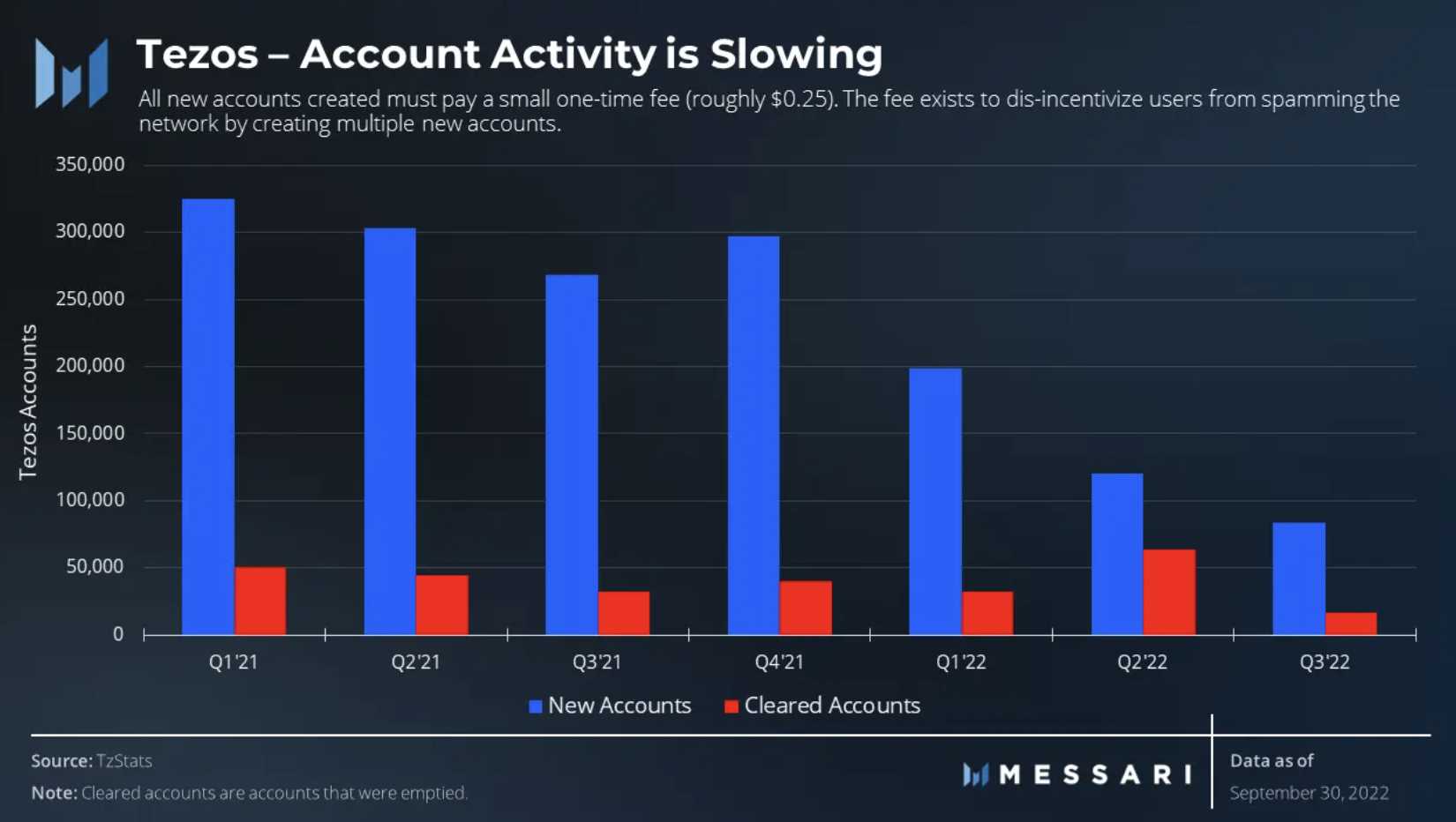 同时,新创建的账户也减少到2021年初以来的最低水平。总体而言,在过去七个季度中,新增账户有六个季度都出现了下降。在分析新帐户创建时,有几个要点需要注意。首先,所有在Tezos上创建的新账户都必须支付少量的一次性费用,通常在0.25美元左右。该费用的存在是为了阻止人们通过创建多个新账户向网络发送垃圾邮件。此外,如果有人第一次获得Tezos资产,如NFT,但没有创建帐户,他们将被排除在该数据集之外。在评估跨生态系统的账户活动时,这些都是需要考虑的重要因素。