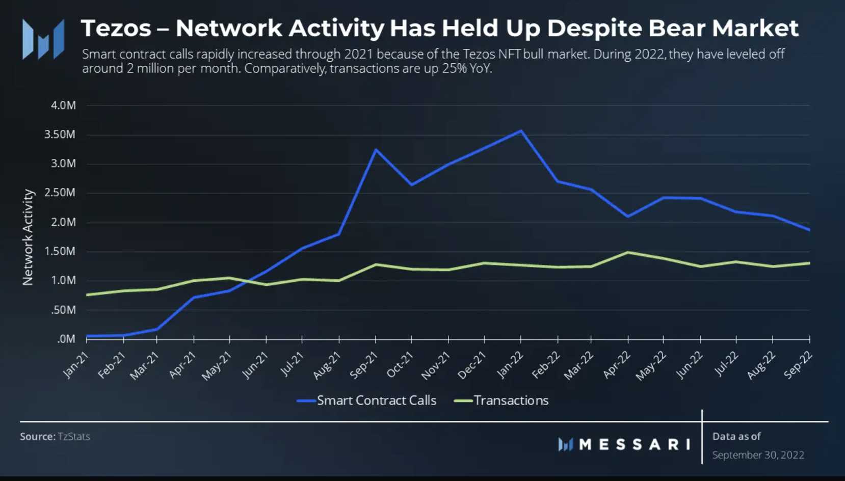 在网络生命的大部分时间里,智能合约调用只是整个活动的一小部分。然而,从2021年第一季度开始,智能合约调用开始迅速增加。在2022年1月的峰值时,他们从每月不到10万人次增加到360万人次。Tezos的上涨始于第一个NFT平台Hic et Nunc的推出,并在随后的Tezos NFT牛市中持续。在2022年的熊市期间,Tezos平均每月有130万笔交易,比2021年的牛市增长了25%。总体而言,网络活动在2022年期间相对平稳,这可以被认为是熊市期间的净利好。