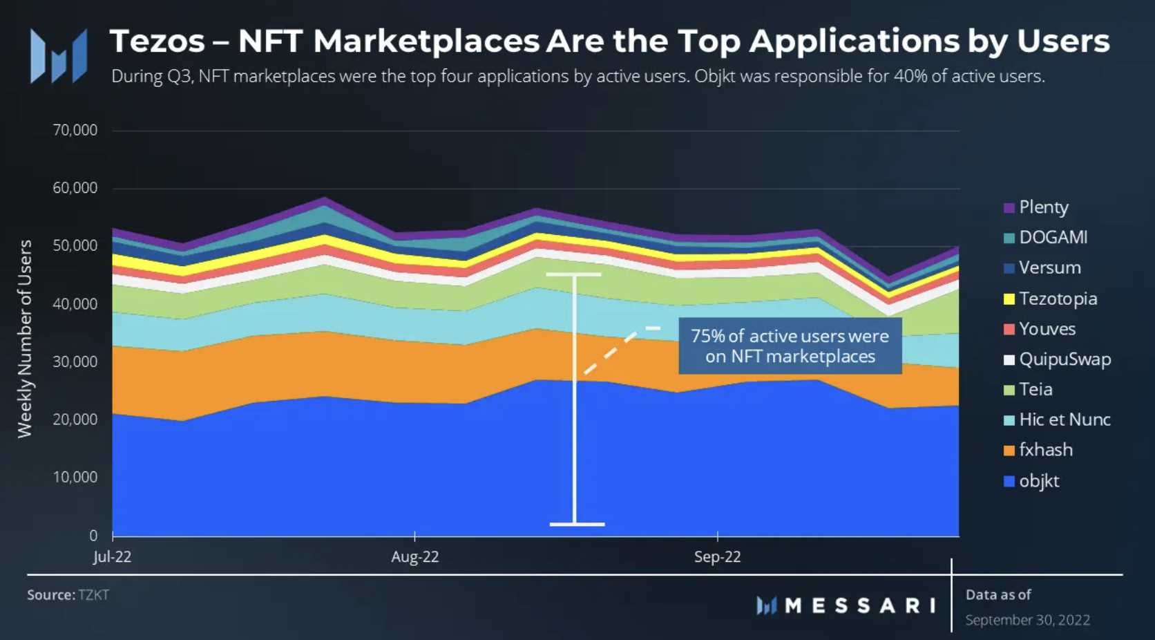 考虑到活跃用户,NFT市场继续占据主导地位。在第三季度,按活跃用户排名前四的应用程序中,NFT市场约有11000名每周独立活跃用户(占整个网络活跃用户的75%)。Objkt是占据主导地位的市场,拥有40%的活跃用户。DeFi以3款应用位居第二,其次是2款游戏。总体而言,第三季度三个领域的活跃用户都在下降。