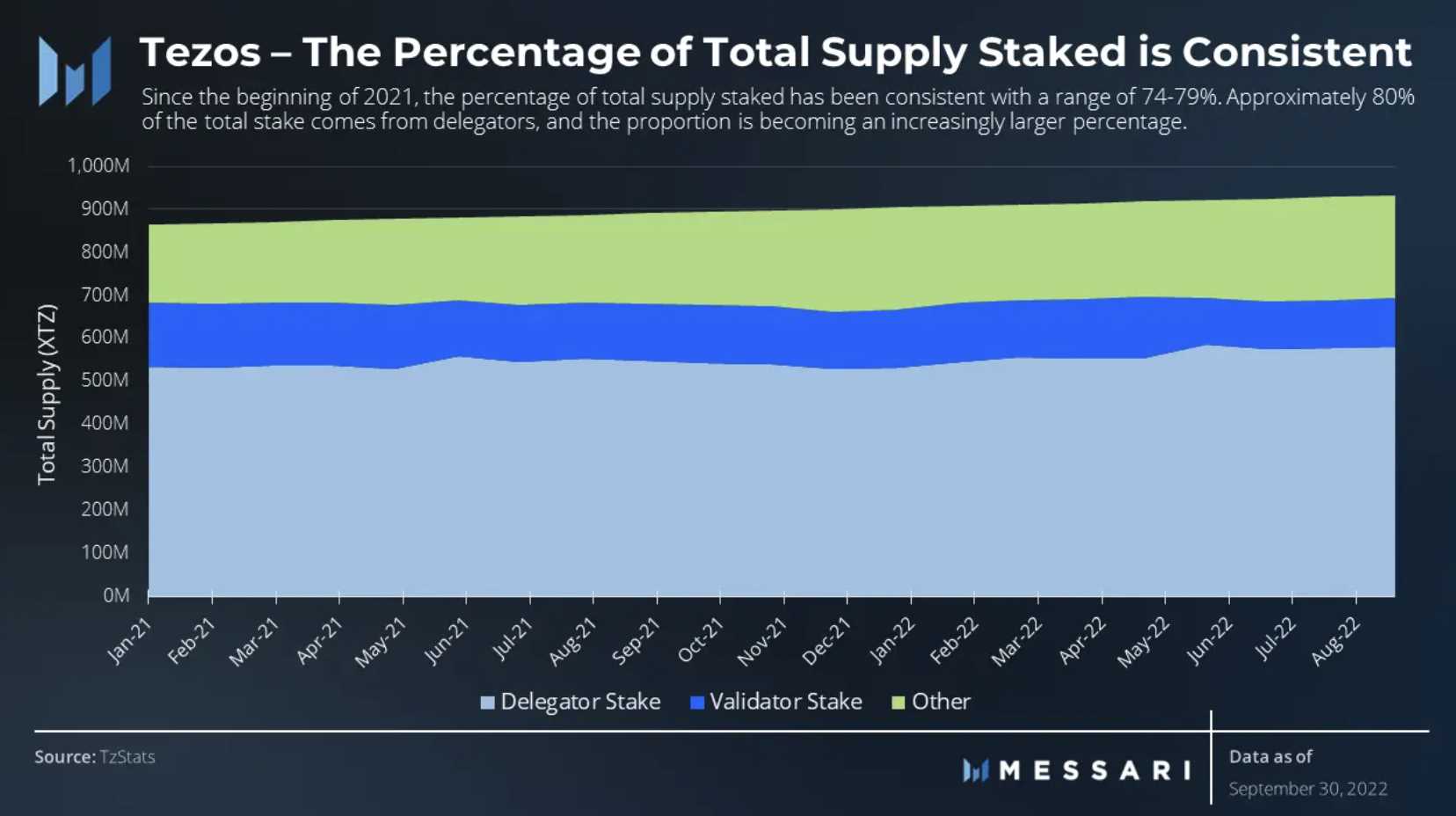 与质押和去中心化相关的指标是一致的。自2021年初以来,质押总供应量的百分比一直保持在74-79%的范围内,其中约80%来自委托人。与去中心化和质押相关指标的一致性表明了一个运作良好且健康的生态系统。