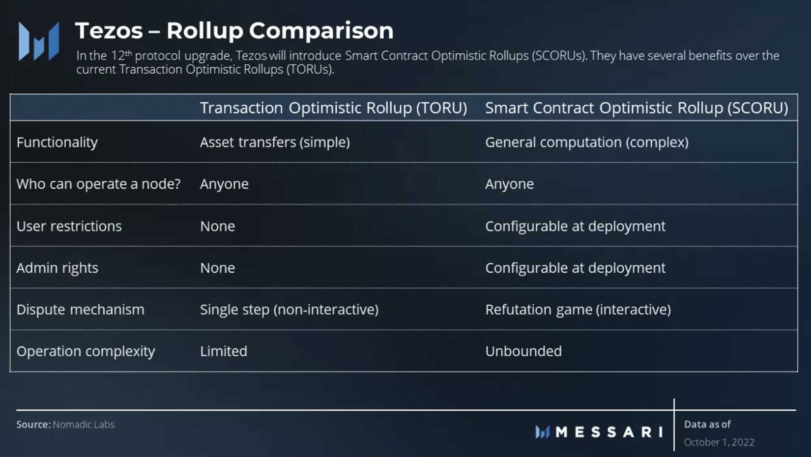 今年6月,Tezos在Jakarta升级期间发布了Transaction Optimistic rollup (TORUs)。TORUs是通过rollup扩展的第一步。作为漫长路线图中的第一个产品版本,TORU被故意简化,只允许资产交换。因此,最低的采用预期,并且网络活动预计不会增加。L升级中即将发布的智能合约乐观卷集(SCORUs)应该会启动活动。SCORUs将通过支持智能合约执行和引入WebAssembly (WASM)执行环境,极大地扩展卷集功能。