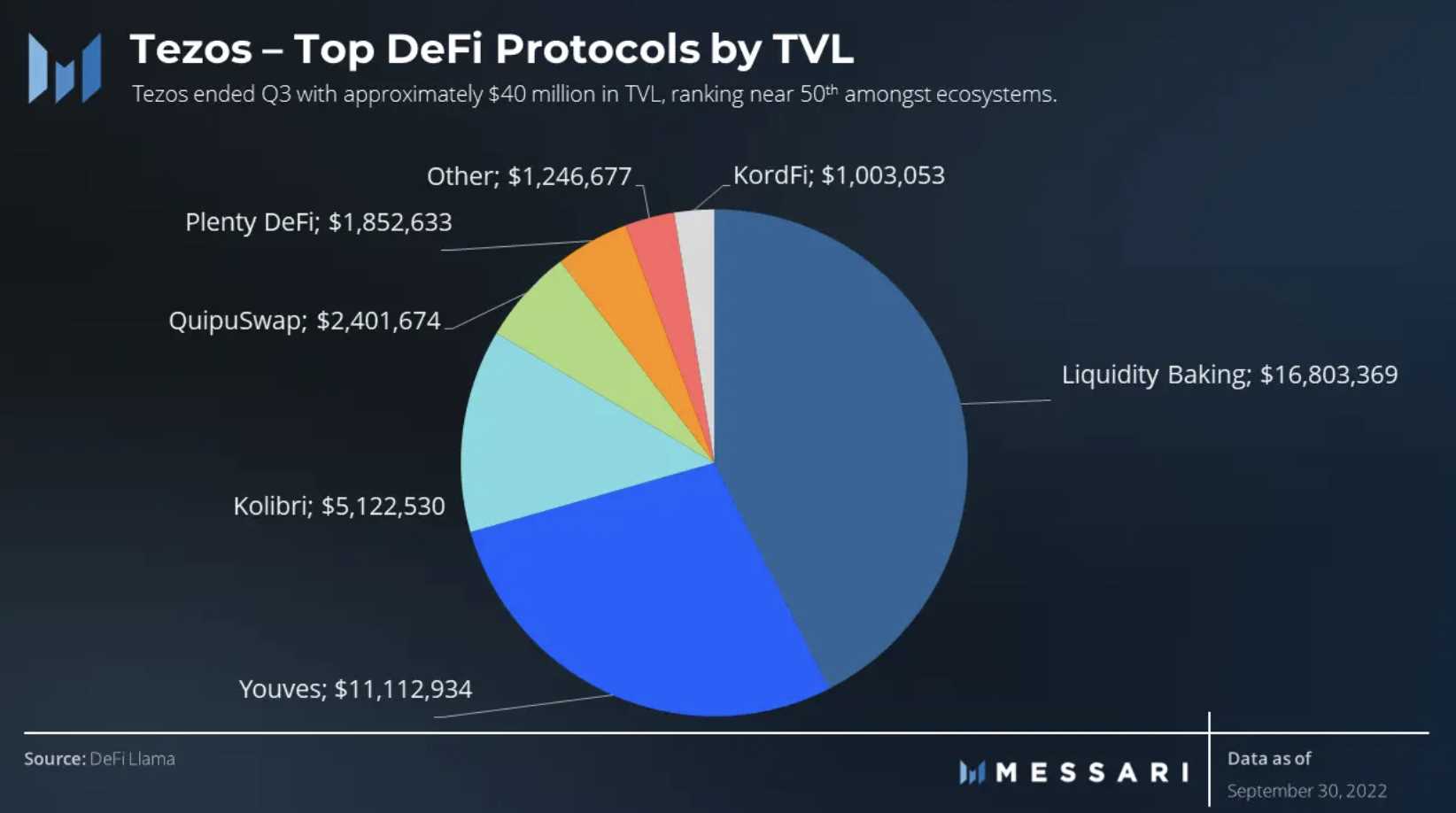 截至2022年第三季度,Tezos TVL约有4000万美元。与2021年第三季度相比,TVL从1.62亿美元下降了76%。总的来说,Tezos TVL在生态系统中排名约为第50位。