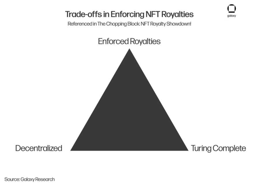 在最新一期的「The Chopping Block」中, Dragonfly 的 Haseeb Qureshi 和 Magic Eden 的 Zhuoxun Yin 讨论了成功完备的版税缴纳系统、去中心化和图灵完备性之间的三难问题。成功优化这三个属性目前是不可行的,这也是 NFT 版税尚未在代币或智能合约层面实施的关键原因。