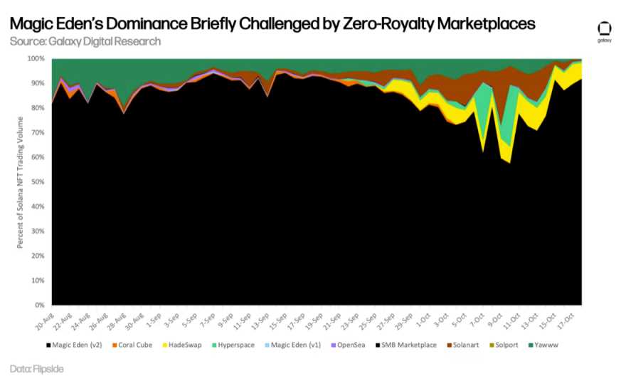 Magic Eden 历来占据 Solana NFT 市场约 90% 的市场份额,其主导地位受到 Yawww 和 Hadeswap 等免版税替代品兴起的挑战。Tiexo 的数据显示,Magic Eden 的市场份额在 10 月份开始急剧下降,在几周的时间里从约 90% 下降到低至约 60%。Magic Eden 为了「江湖地位」迅速反应, 宣布他们也在平台上引进版税选择权,以便与这些快速崛起的挑战者公平竞争。自公告发布以来,Magic Eden 的市场份额已经回升至之前的 90% 左右。