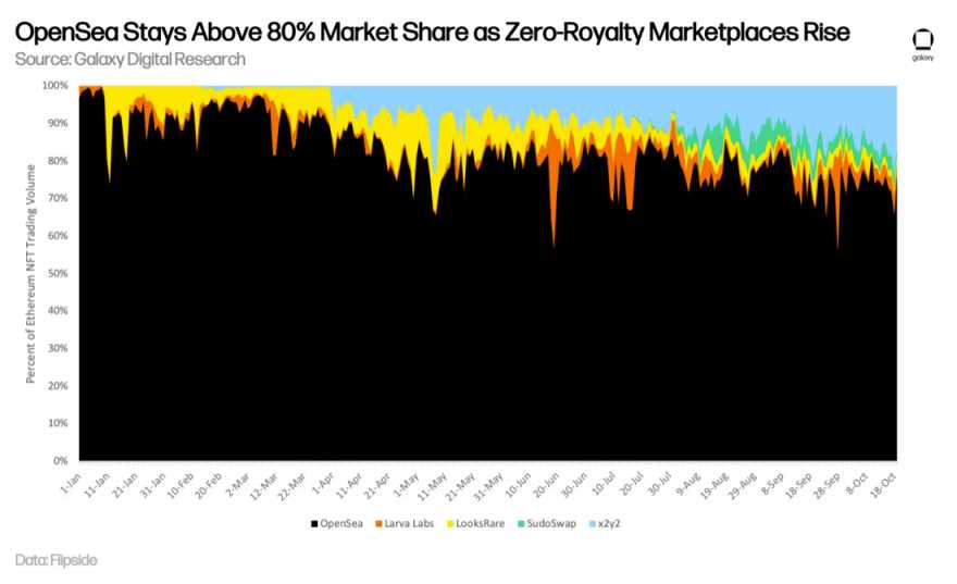 正因为在智能合约层面上的技术难题,版税一事成了 NFT 市场强制执行的准则。换句话说,版税是由社会规范强制执行的,市场实际上是代表创作者收取版税作为其持续创造的激励(类似于小费)。因此,大多数 NFT 市场已经实施了版税支付解决方案,以便用持续的收入流来吸引创作者。这在 NFT 市场发展的早期阶段尤 e 为 i 重要,因为协议需要安抚市场的双方,即创作者和收集者。而现在,由于 NFT 空间在过去两年里已经非常成熟,市场已经做出了相应的调整。如上所述,一些市场如 SudoSwap 已经完全取消了版税支付,以吸引尽可能多的流动性。