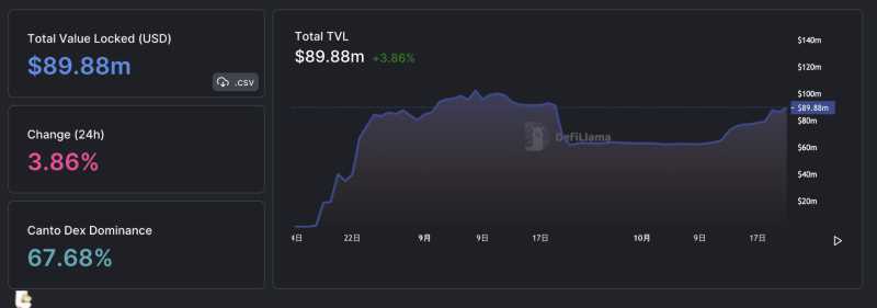 据 DeFiLlama 资料显示,Canto TVL(总锁住使用价值)为 8900 万美元。